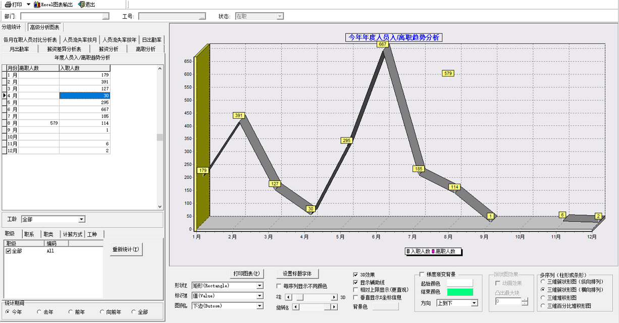 通過同鑫人事管理軟件中的高極分析圖表,按照員工的月出勤率,日出勤率,流失率,薪資差異分析等,實時掌握員工每個時間段的出勤情況,離職情況及各個崗位的薪資情況,