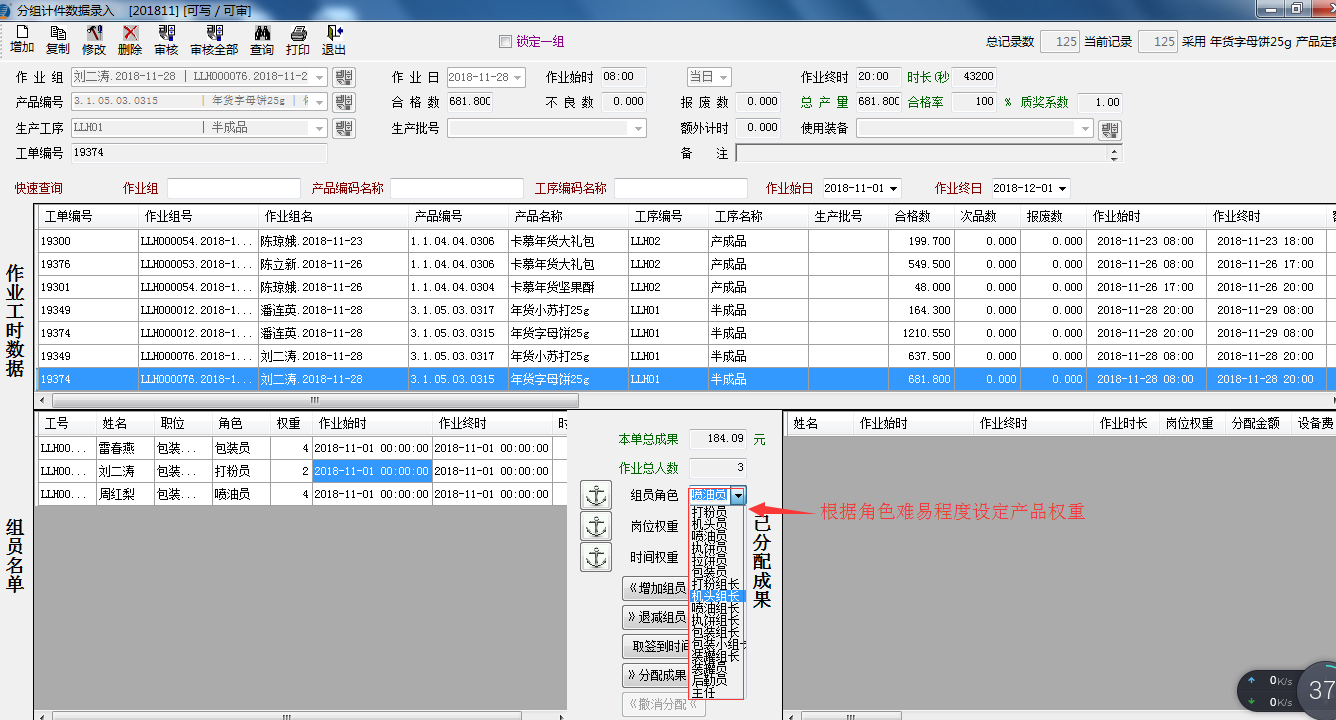 對于計件工資產(chǎn)品工序多且工序難易程度不一等綜合因素考慮,為了保證能夠正??焖俳y(tǒng)計分析員工個人參入計件所得,特別啟用角色加權(quán)重的模式,確保每個產(chǎn)品可以根據(jù)生產(chǎn)難易程度合理設(shè)置不同角色權(quán)重,如下圖: