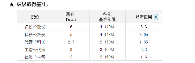 2.定義每個(gè)關(guān)鍵職位的任職標(biāo)準(zhǔn),如社員升為主管需要多個(gè)任職年限,需要多少考核指求點(diǎn),可以追溯往年的所有考核指標(biāo)項(xiàng)目,現(xiàn)將該企業(yè)的職位升職資格表附下圖: