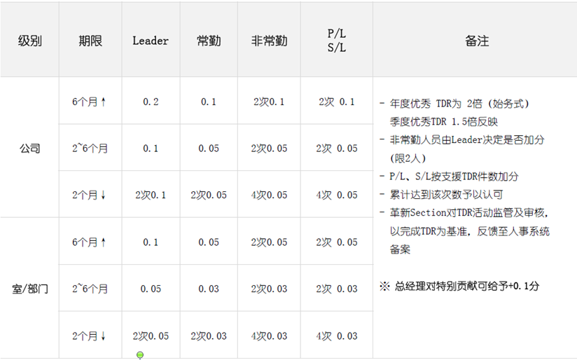 3.定義了七個(gè)職級(jí)的任職審核年限標(biāo)準(zhǔn),每個(gè)職級(jí)劃分為1年、2年、3年、4年及4年以上的認(rèn)證年限,并定義了每個(gè)職級(jí)的加減分項(xiàng):人事評(píng)價(jià)、獲獎(jiǎng)、TDR、語(yǔ)言能力、資格證/留學(xué)、社內(nèi)講師/內(nèi)部OJT、標(biāo)準(zhǔn)改善、提案、N-TED等方面的考核加減分項(xiàng);對(duì)必要資格定義如下:革新學(xué)校結(jié)業(yè)(在職期間需通過(guò)1次即可),且為學(xué)校結(jié)課時(shí)排名為參與人員的前10%,加分處理為第1名:0.1分;第2名:0.05分;而科長(zhǎng)升為次長(zhǎng):TOPIK需要2級(jí)以上;次長(zhǎng)升部長(zhǎng):TOPIK需3級(jí)以上;附圖為任證年限標(biāo)準(zhǔn):