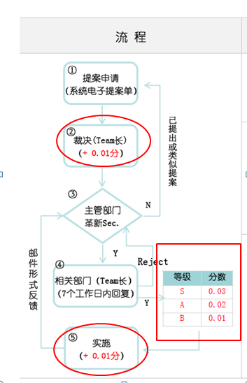 6.個(gè)人工作完成了,培訓(xùn)的工作也做好了,那如何保證一個(gè)好的制度的傳承,不好的制度能及時(shí)修正與改正呢?下面關(guān)于晉升的的一個(gè)關(guān)鍵考核項(xiàng)目就是對(duì)之方面的一個(gè)強(qiáng)力保證,就是你關(guān)于制度的建議要有提案,要形成企業(yè)管理文件并歸檔,對(duì)企業(yè)制度的建立與完善要有貢獻(xiàn),我們來(lái)看看該企業(yè)的提案流程與對(duì)應(yīng)的晉升加分